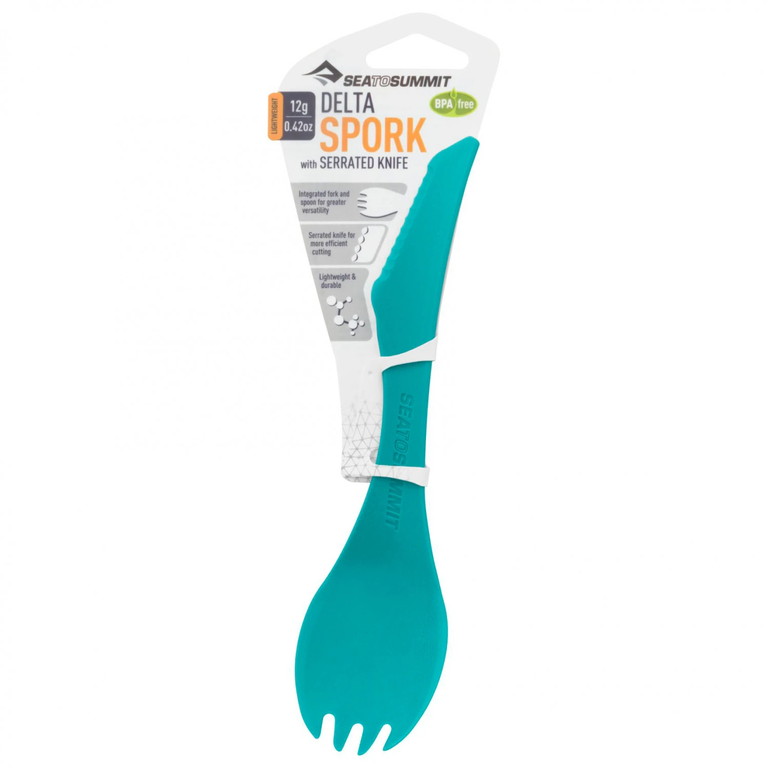 Der ist wirklich immer mit dabei – der Delta Spork von Sea to Summit! Der Spork, oder auch Göffel, enthält Gabel, Löffel und Messer in einem Teil – das spart viel Gewicht und dazu noch Abwasch ein. Er besteht aus lebensmittelechtem, BPA-freiem und glasverstärktem Nylon 66. Das Messer im Wellenschliff ist im Griff integriert, schränkt aber das bequeme Greifen des Sporks trotzdem nicht ein. Egal ob beim Trekking, auf Wandertour oder für den Snack unterwegs – der Spork von Sea to Summit ist ein absolut praktischer Begleiter, der im Gepäck kaum ins Gewicht fällt!